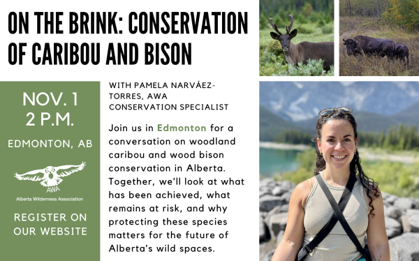 Join AWA’s conservation specialist Pamela Narváez-Torres in Edmonton for a conversation on woodland caribou and wood bison conservation in Alberta. This talk will highlight the history of these iconic species and the challenges they continue to face on the landscape today. We’ll also explore conservation efforts led by the Alberta Wilderness Association (AWA), including work to protect southern mountain caribou in the Upper Smoky area and the Ronald Lake buffalo herd. Together, we’ll look at what has been achieved, what remains at risk, and why protecting these species matters for the future of Alberta’s wild spaces.