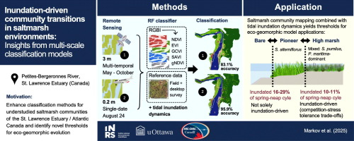 This novel study presents vegetation community maps for saltmarshes along the Petites-Bergeronnes River, Québec (Canada), derived from supervised classification models of varying spatial and temporal resolutions. Random forest classification was performed using medium-resolution (3 m) PlanetScope satellite imagery, incorporating 12 images from the snow-free season (May–October 2023). High-resolution (0.2 m) multispectral imagery from the Government of Québec, Canada, supported a single-date (August 24, 2023) classification for the same region. This marks the first temporal feature approach to saltmarsh classification in the St. Lawrence Estuary, and the first direct comparison of community-level saltmarsh classification contrasting high spatial- versus high temporal-resolution. For the first time, tidal inundation dynamics were explicitly incorporated during classification, using inundation time as a predictor variable. This improved overall classification accuracy to 83% for the temporal imagery model and 96% for the high-resolution model. Moving beyond regional mapping, community extents were compared with tidal inundation data to identify thresholds for eco-geomorphic transitions and develop stress functions for saltmarsh evolution modeling. A region-independent threshold of ∼11% inundation time marked the majority transition from pioneer to high marsh vegetation. Mudflat-to-pioneer transitions were region-dependent (16–29% inundation time), indicating that the lower elevation limit of establishment is not solely dictated by inundation stress. As the first inundation thresholds identified independently of tidal datums for saltmarshes dominated by S. alterniflorus, S. pumilus, and P. maritima, these findings represent a significant advancement for saltmarsh eco-geomorphic studies across diverse geographies.